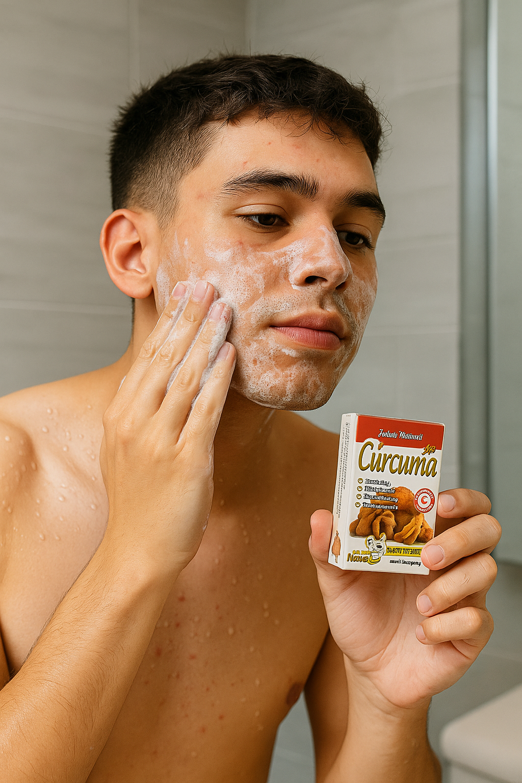 La cúrcuma es conocida por sus propiedades cicatrizantes, antiinflamatorias y antioxidantes. El jabón limpia profundamente, elimina bacterias causantes del acné y ayuda a regenerar la piel para reducir manchas y cicatrices.